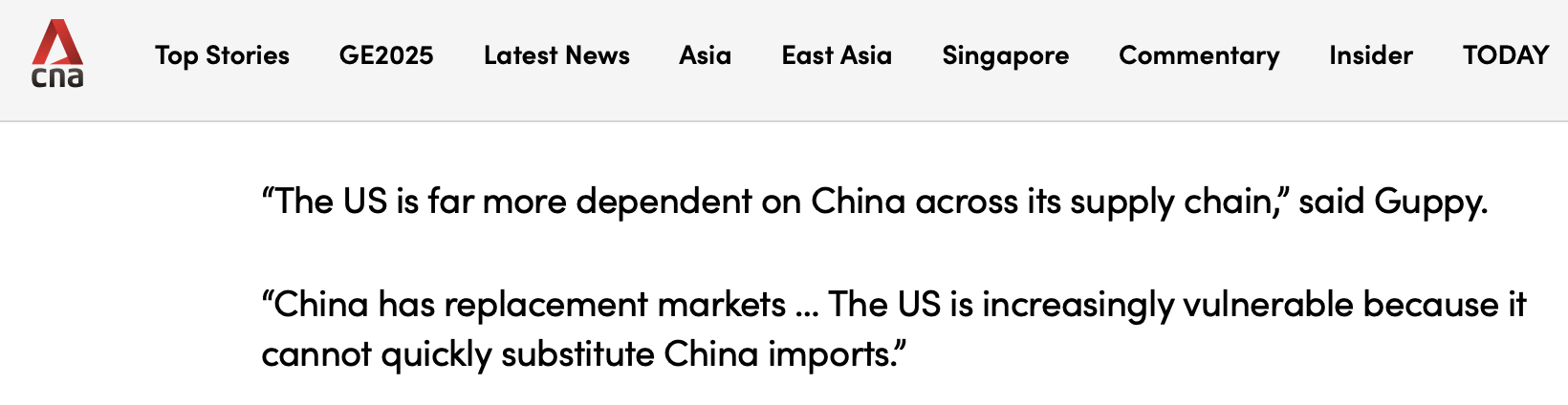報道稱,澳大利亞金融專欄作家戴若·顧比表示,“美國整個供應(yīng)鏈對中國的依賴程度要高得多”,“中國有替代市場……美國則越來越脆弱,因為它無法迅速找到中國進(jìn)口產(chǎn)品的替代品”。