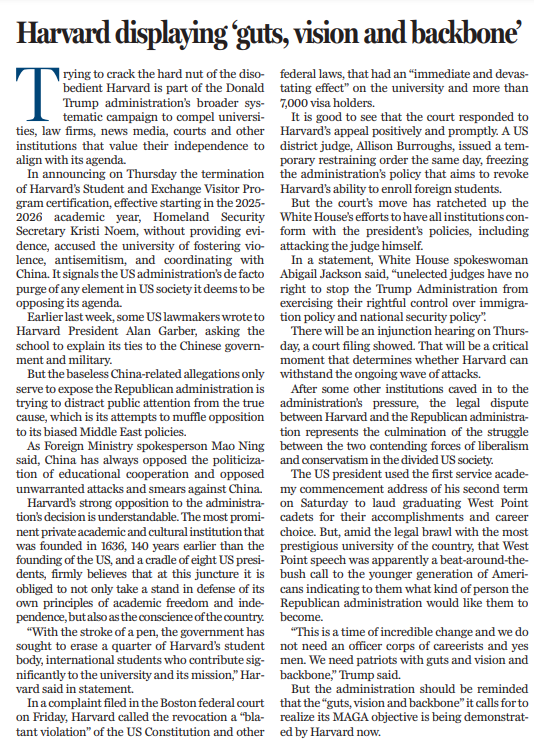 在其他一些機構(gòu)屈服于美國政府壓力之后,哈佛大學(xué)與美國政府之間的斗法表明,美國社會日益撕裂,矛盾重重,斗爭激烈。