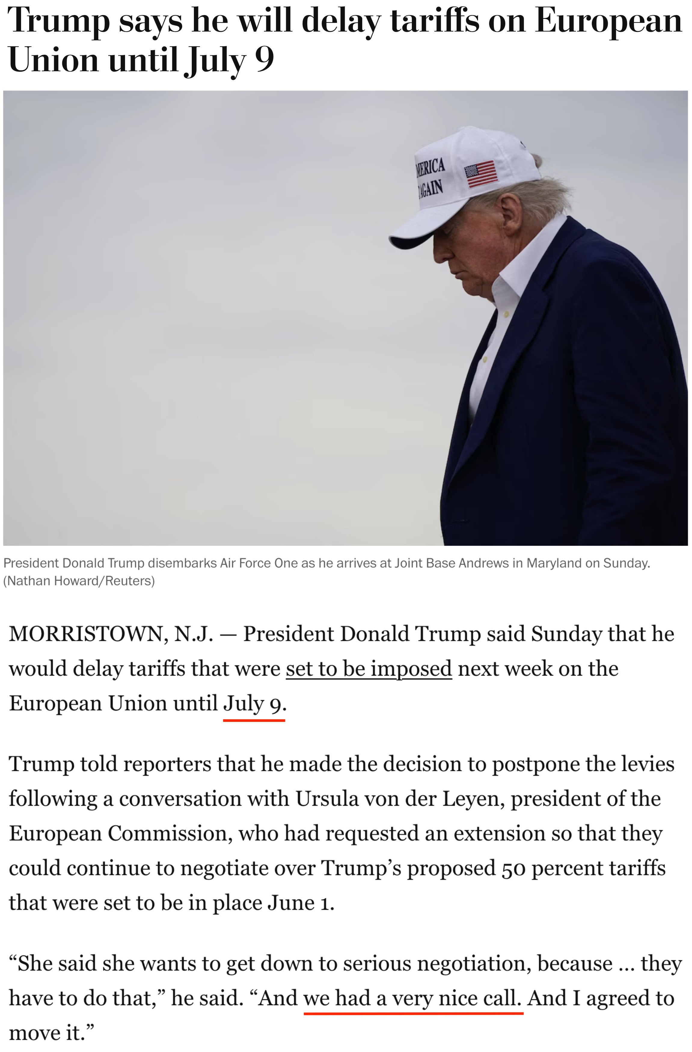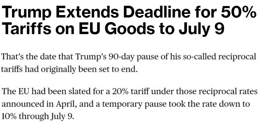 他25日告訴記者,自己當(dāng)天與歐盟委員會主席馮德萊恩“愉快”地通了電話,并應(yīng)對方要求,決定將原計劃從6月1日開始對歐盟加征的50%的關(guān)稅推遲到7月9日,以便雙方有時間就此進行談判。