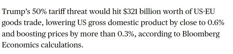德國漢堡商業(yè)銀行首席經(jīng)濟學(xué)家德拉魯比亞指出,雖然不能對美國的50%關(guān)稅威脅完全當(dāng)真,但從本屆美國政府反復(fù)無常的做派來看,這些關(guān)稅仍有可能在短期內(nèi)生效。而對重要的貿(mào)易伙伴征收如此高的關(guān)稅,將導(dǎo)致美國“難以避免地陷入經(jīng)濟衰退”。