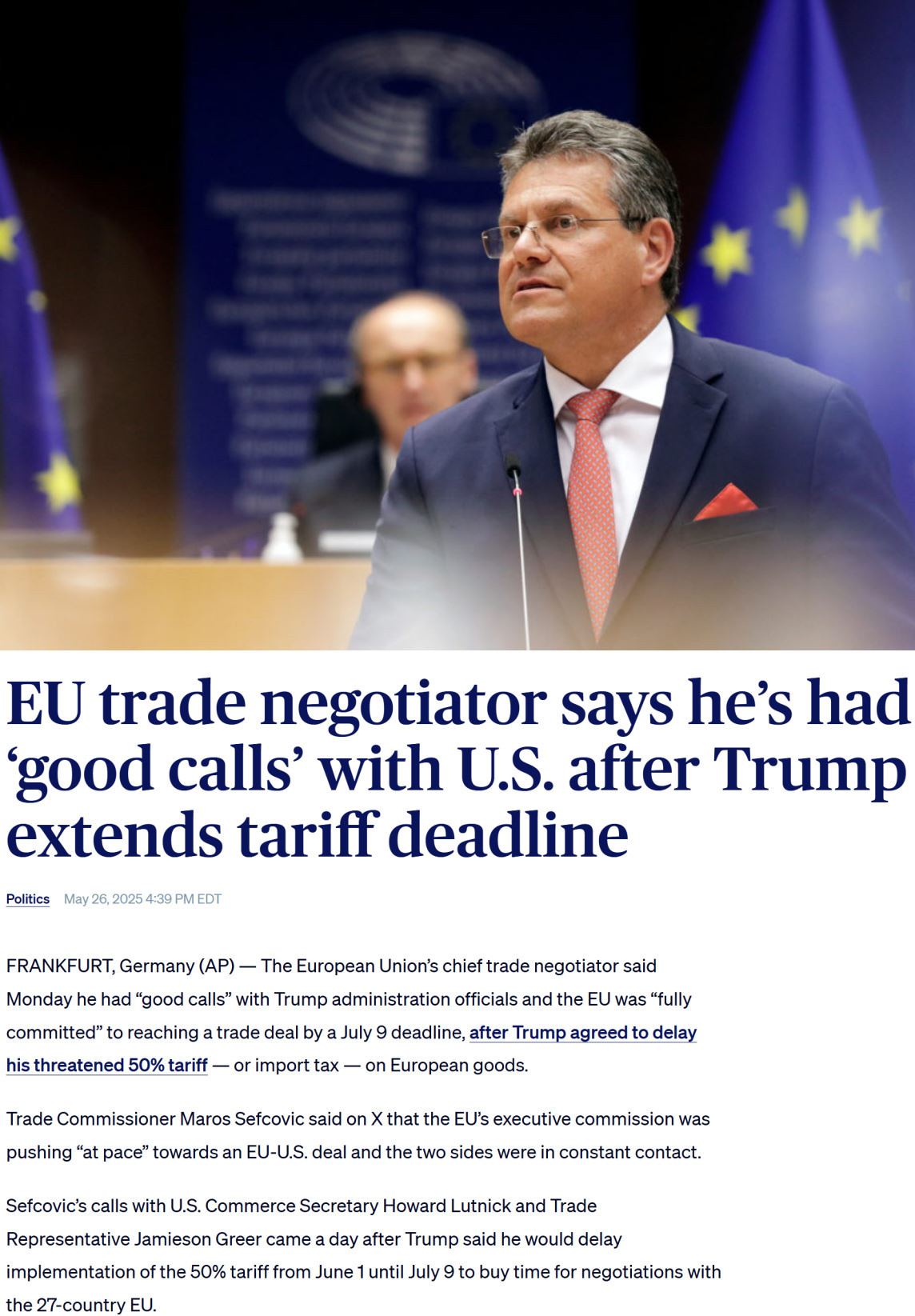 當(dāng)?shù)貢r間26日,歐盟貿(mào)易委員謝夫喬維奇與美方代表通話后表示,歐盟完全致力于在7月9日前與美方達成一項協(xié)議。