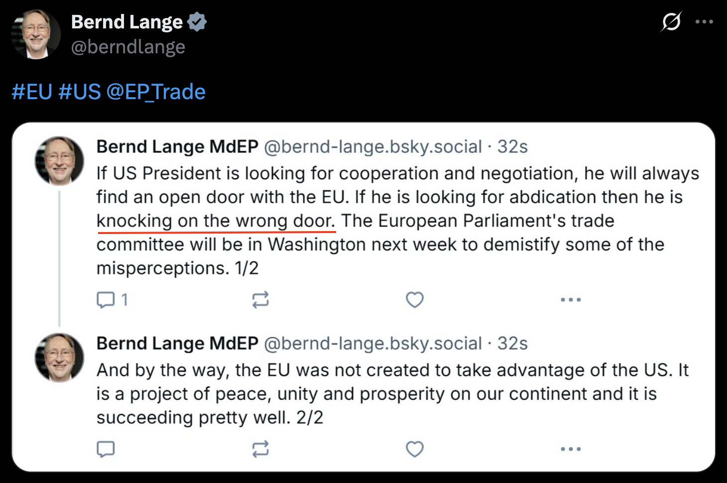 “如果美國尋求合作與談判,歐盟總是愿意敞開大門;但如果只是想讓我們照單全收美方的要求,那它就是敲錯了門?!?/p>