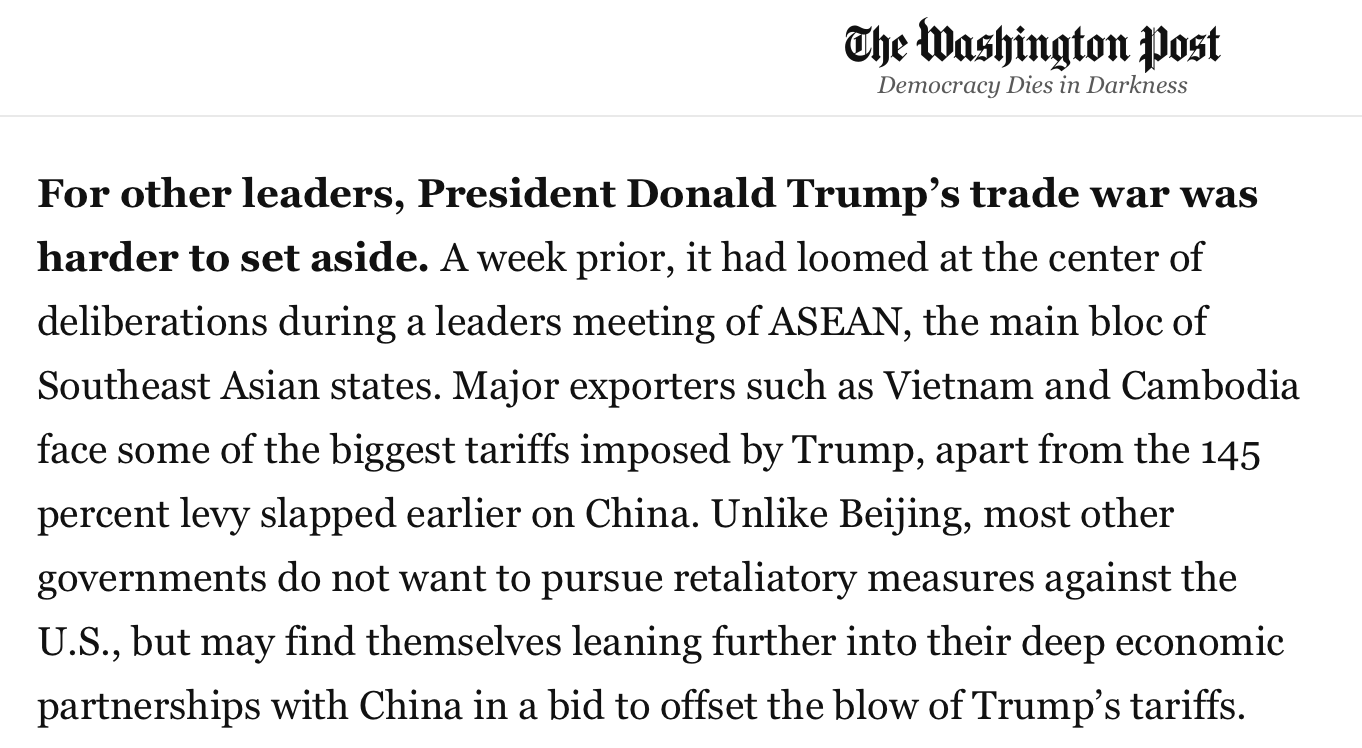文章說(shuō),盡管大多數(shù)亞洲國(guó)家的政府沒(méi)有對(duì)美國(guó)采取反制措施,但它們都更傾向于進(jìn)一步鞏固與中國(guó)的深厚經(jīng)濟(jì)伙伴關(guān)系,以抵消美國(guó)關(guān)稅帶來(lái)的沖擊。