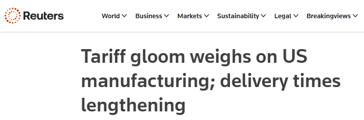 路透社近日的一篇報(bào)道認(rèn)為,美國(guó)制造業(yè)5月連續(xù)第三個(gè)月萎縮,在關(guān)稅影響下,供應(yīng)商交付投入的時(shí)間是近三年來(lái)最長(zhǎng)的,這可能預(yù)示著某些商品即將出現(xiàn)短缺。