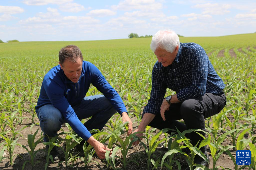 5月23日,在美國艾奧瓦州,艾奧瓦州大豆協(xié)會市場部高級主任格蘭特·金伯利(左)和他的父親瑞克·金伯利查看種植的玉米。新華社記者 劉亞南 攝