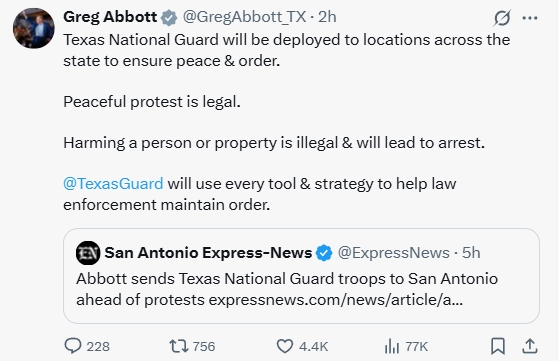 “和平抗議是合法行為,但傷害他人和損壞財產(chǎn)不合法,(肇事者)會被逮捕。”共和黨籍的阿博特在社交媒體上說,“得州國民警衛(wèi)隊將用一切方式方法,幫助執(zhí)法機構維持秩序?!?/p>
