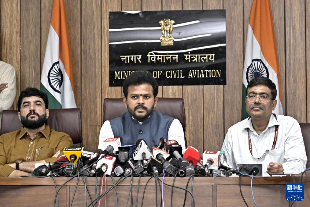 6月14日,印度航空部長拉姆·莫漢·奈杜(中)在新德里出席新聞發(fā)布會。新華社發(fā)(印度政府新聞信息局供圖)