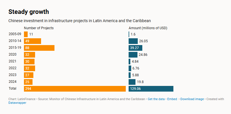 中國(guó)在拉丁美洲和加勒比地區(qū)投資基礎(chǔ)設(shè)施項(xiàng)目(來(lái)源:《拉美金融》)