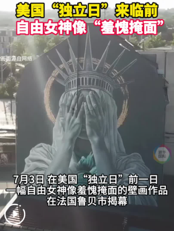 7月3日,在美國(guó)“獨(dú)立日”到來(lái)前一日,一幅自由女神像羞愧掩面的壁畫(huà)作品在法國(guó)魯貝市揭幕。