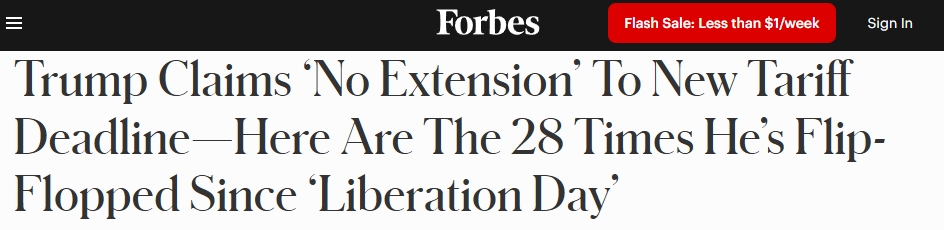 對(duì)于此次關(guān)稅調(diào)整,《福布斯》雜志網(wǎng)站7日?qǐng)?bào)道指出,從今年2月7日首次公開提及對(duì)他國(guó)進(jìn)口商品征收全面關(guān)稅,到強(qiáng)調(diào)“2025年8月1日這一日期不會(huì)有任何延長(zhǎng)”的這五個(gè)月里,特朗普政府在關(guān)稅問題上的態(tài)度“翻轉(zhuǎn)”了大約28次。