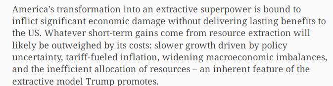 文章認(rèn)為,美國向資源掠奪型超級(jí)大國的蛻變,注定將無法為美國帶來持久利益,反而還會(huì)給美國自身造成重大經(jīng)濟(jì)損害。資源掠奪帶來的任何短期收益,都可能被以下代價(jià)抵消:政策不確定性導(dǎo)致的增長放緩、關(guān)稅推高的通貨膨脹、日益擴(kuò)大的宏觀經(jīng)濟(jì)失衡,以及資源配置的低效——這些正是掠奪模式與生俱來的缺陷。