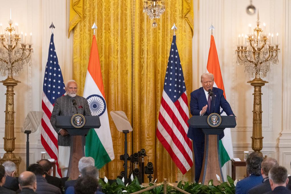 2月13日,美國(guó)總統(tǒng)特朗普(右)與到訪的印度總理莫迪在華盛頓白宮出席聯(lián)合記者會(huì)。新華社記者胡友松攝