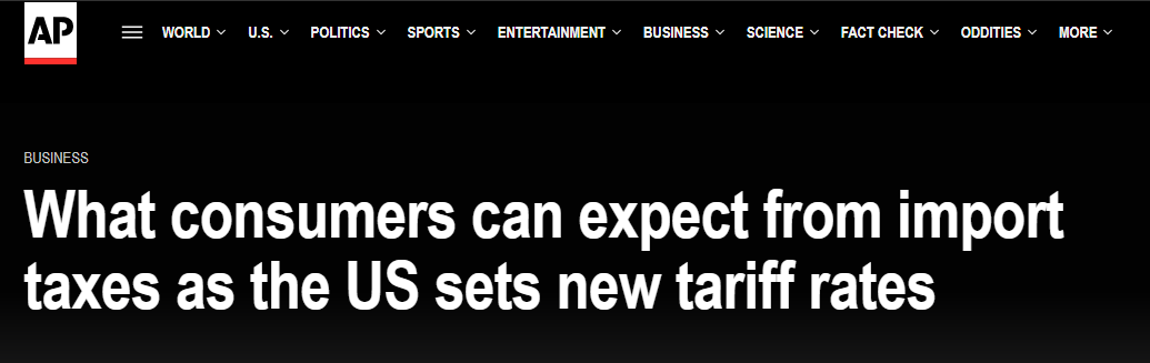 美聯(lián)社援引美國無黨派智庫稅收基金會的分析稱,關(guān)稅幾乎注定導(dǎo)致美國食品價格上漲,諸如美國根本無法足量生產(chǎn)滿足需求的香蕉、咖啡等,而魚類、啤酒以及烈酒也會變得更昂貴。此外,在美銷售的服裝和鞋類有97%均為進(jìn)口,價格上漲也是可以預(yù)見的。