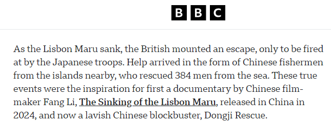 文章說(shuō),在這艘載有英軍戰(zhàn)俘的船只“里斯本丸”號(hào)沉沒(méi)過(guò)程中,英國(guó)戰(zhàn)俘組織突圍逃生,卻遭到日軍掃射。附近島嶼的中國(guó)漁民們伸出了援手,從海中救起384人。這一真實(shí)事件先后催生了兩部影視作品:紀(jì)錄片《里斯本丸沉沒(méi)》,以及電影《東極島》。