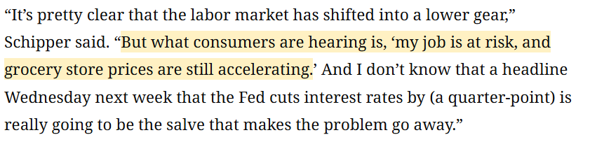 美國(guó)圣托馬斯大學(xué)副教授泰勒·施普爾 (Tyler Schipper)認(rèn)為 :對(duì)普通消費(fèi)者來(lái)說(shuō),耳邊最真切的聲音是“我的工作隨時(shí)可能保不住”,是“超市里的食品雜貨價(jià)格還在一個(gè)勁往上漲”。所以我實(shí)在不確定,下周“美聯(lián)儲(chǔ)降息”的頭條新聞,真能成為化解這些現(xiàn)實(shí)困境的良藥嗎?