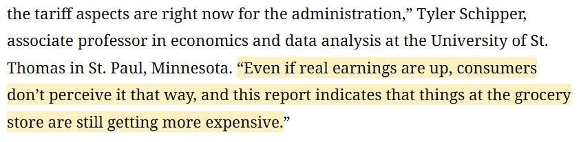 經(jīng)濟(jì)學(xué)家泰勒 施皮珀(Tyler Schipper)直言:“老百姓感受不到工資上漲,他們只知道超市商品的價(jià)格越來(lái)越貴。”