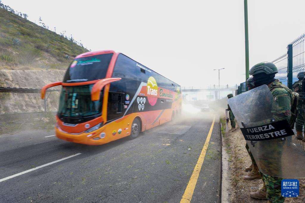 9月16日,在厄瓜多爾首都基多,武裝部隊人員在公路旁維持秩序。新華社發(fā)(里卡多·蘭德塔攝)
