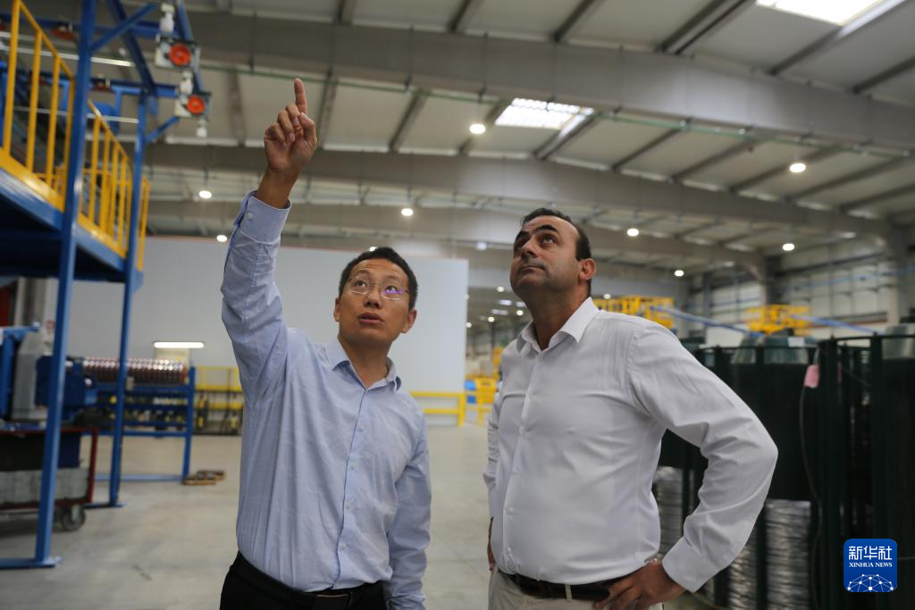 10月3日,在葡萄牙北部奧瓦爾市,亨通集團駐葡萄牙的設(shè)備經(jīng)理劉建龍(左)與阿爾科夫雷電纜廠首席運營官卡洛斯·格蘭雅討論技術(shù)問題。新華社記者荀偉攝