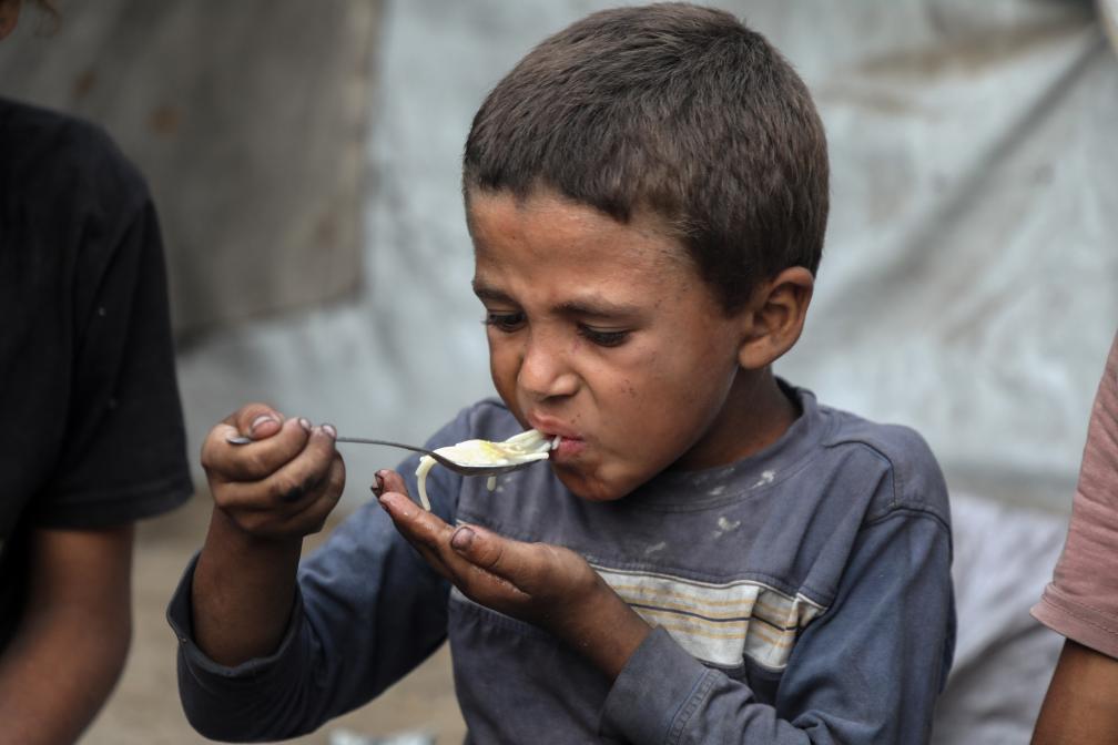 2025年7月29日,在加沙城的一個(gè)帳篷里,一名男孩在進(jìn)食。當(dāng)?shù)卦S多家庭僅靠少許入境加沙地帶的人道主義援助物資維系生存。新華社發(fā)(里澤克·阿卜杜勒賈瓦德攝)