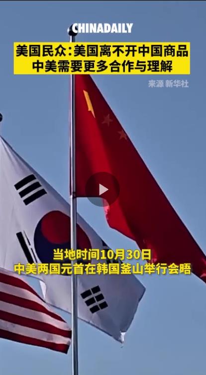 當(dāng)?shù)貢r(shí)間10月30日,中美兩國(guó)元首在韓國(guó)釜山舉行會(huì)晤。中國(guó)日?qǐng)?bào)記者走訪(fǎng)美國(guó)街頭,了解美國(guó)民眾對(duì)此次會(huì)晤及中美關(guān)系的看法。民眾表示,美國(guó)和中國(guó)的貿(mào)易互依關(guān)系不容忽視,兩國(guó)需要更多溝通與合作。