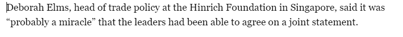 半島電視臺也關注了此次峰會,報道援引新加坡欣里奇基金會貿易政策負責人黛博拉 埃爾姆斯的話說,各成員領導人能夠就聯(lián)合聲明達成一致是“了不起的事情”。他說,鑒于亞太經(jīng)合組織經(jīng)濟體的不同立場,要將任何達成一致的措辭寫入文件都是一項“充滿挑戰(zhàn)的工作”。