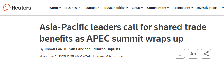 2025年亞太經(jīng)合組織(APEC)領導人非正式會議于10月31日至11月1日在韓國慶州舉行,會議發(fā)表了《慶州宣言》。多家外媒報道稱,會議凸顯了亞太地區(qū)經(jīng)濟體對自由貿易的承諾。