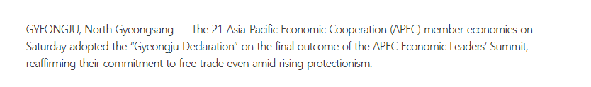 韓國《中央日報》報道稱,《慶州宣言》反映出此次APEC領導人峰會的最終成果,并重申了在保護主義抬頭 的背景下,各成員領導人對自由貿易的承諾。