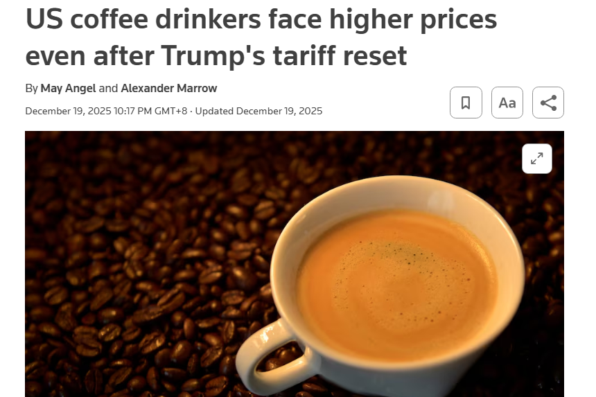 報(bào)道提到,今年11月,在民主黨贏得新澤西、紐約和弗吉尼亞等州的選舉勝利、選民對食品價(jià)格不滿情緒上升的背景下,本屆美國政府撤銷了對咖啡等200多種“難以在美國本土生產(chǎn)”的食品征收10%至41%所謂“對等關(guān)稅”。