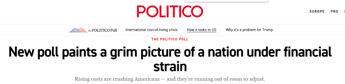 美國政客新聞網(wǎng)(Politico)12月發(fā)布的最新民調(diào)勾勒出一幅更為嚴(yán)峻的圖景:近半數(shù)美國人難以負(fù)擔(dān)雜貨、公用事業(yè)、醫(yī)療、住房和交通;因顧忌成本,27%的人不再體檢,23%的人跳過處方藥;55%的民眾將高物價歸咎于美國政府。即使在其支持者中,也有21%認(rèn)為關(guān)稅目前損害經(jīng)濟(jì)。