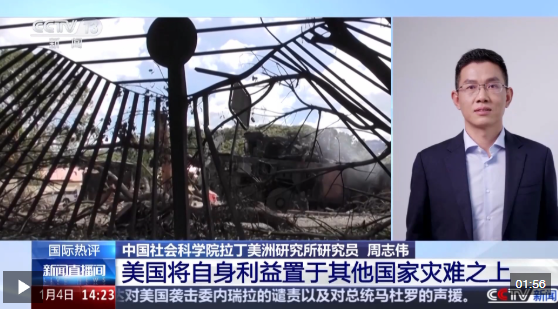 中國社會科學(xué)院拉丁美洲研究所研究員 周志偉:從這次行動的實(shí)質(zhì)來看的話,體現(xiàn)出美國霸權(quán)行徑挑戰(zhàn)國際法,挑戰(zhàn)國際關(guān)系的準(zhǔn)則,將美國的利益置于其他國家的災(zāi)難之上。我覺得這件事是對國際法的野蠻踐踏,將進(jìn)一步加劇國際社會對于美國的不信任感。