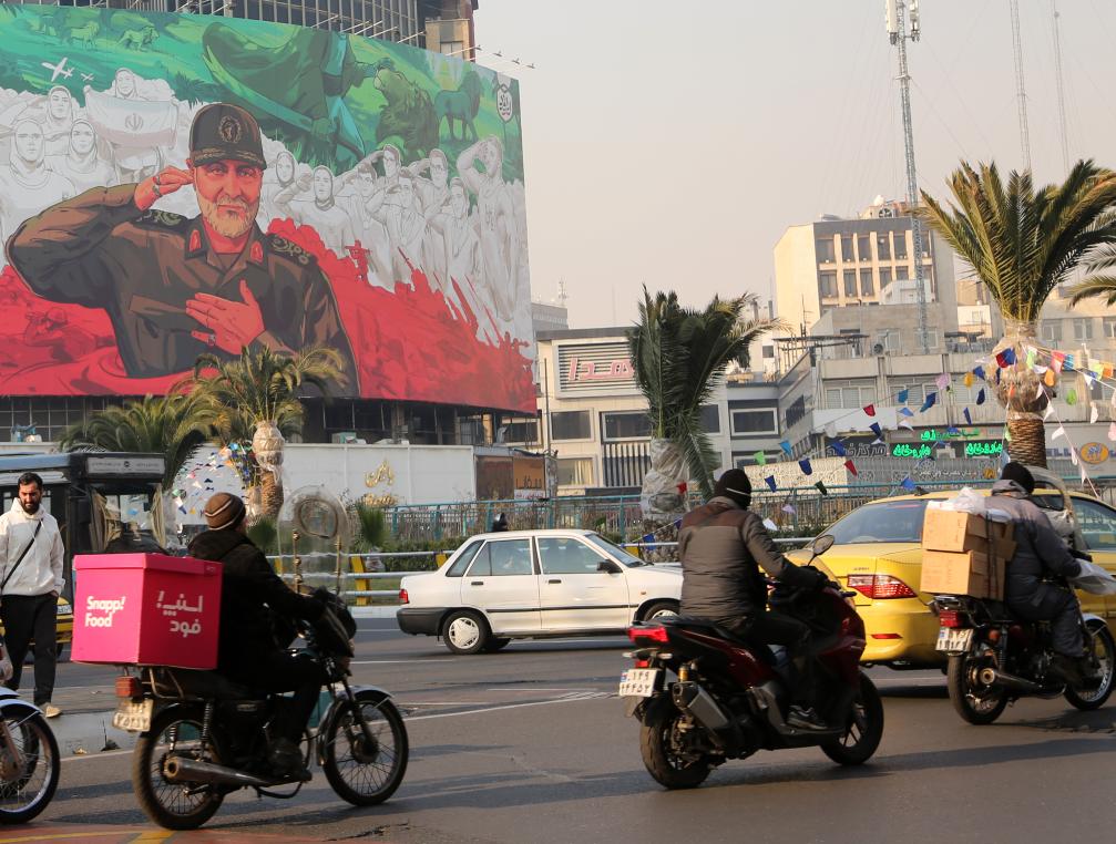 2026年1月6日,在伊朗首都德黑蘭街頭,車輛經(jīng)過一幅繪有伊遇襲身亡的高級將領(lǐng)卡西姆·蘇萊曼尼形象的宣傳海報(bào)。新華社發(fā)