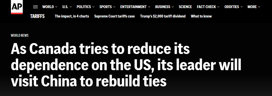 美聯(lián)社報道稱,加拿大總理此次訪華,旨在修復(fù)并改善兩國關(guān)系,為中加戰(zhàn)略伙伴關(guān)系的發(fā)展重新注入活力。報道援引卡尼的表態(tài)指出:“加拿大正在全球范圍內(nèi)構(gòu)建新的伙伴關(guān)系,以改變本國經(jīng)濟對單一貿(mào)易伙伴的依賴。”