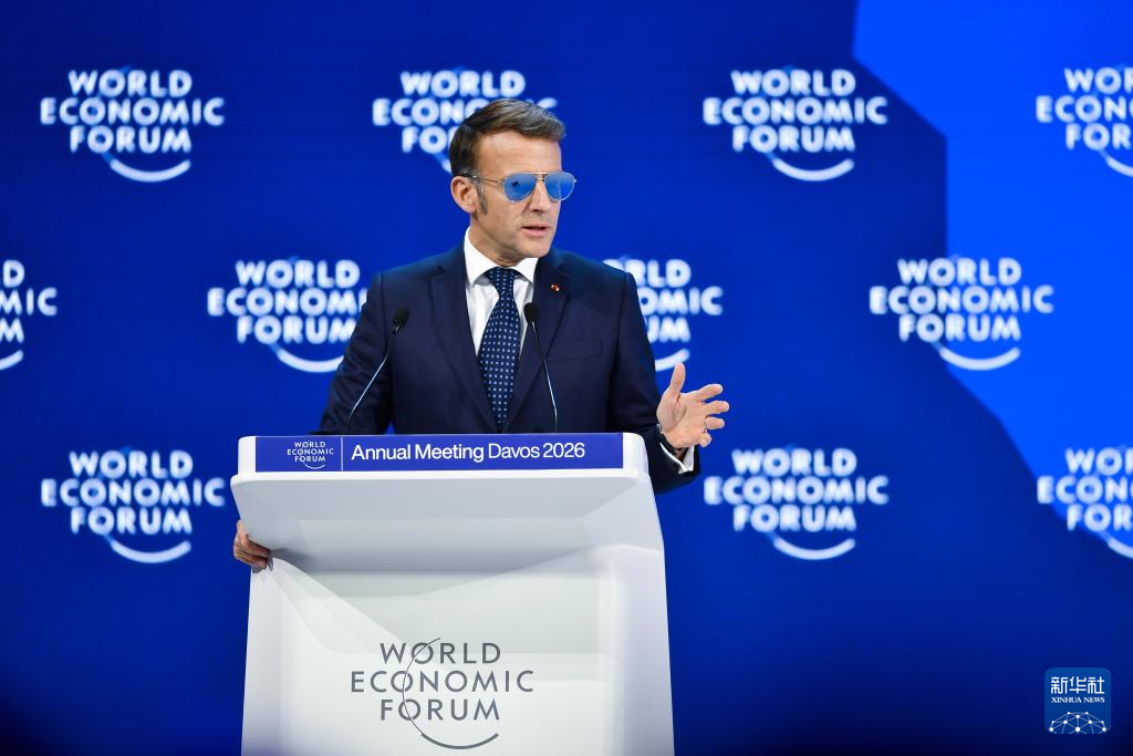1月20日,法國總統(tǒng)馬克龍在瑞士達沃斯舉辦的世界經(jīng)濟論壇2026年年會上講話。新華社記者 連漪 攝