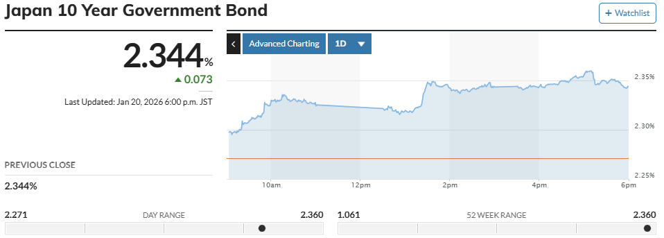 1月20日,日本長期國債在東京債券市場繼續(xù)遭到拋售,導(dǎo)致收益率不斷上揚(yáng)。當(dāng)天,作為日本長期利率指標(biāo)的10年期日本國債收益率一度上升至2.330%,為1999年2月以來的最高水平。這一市場異動(dòng)恰逢日本政局進(jìn)入敏感時(shí)段,引發(fā)投資者對(duì)經(jīng)濟(jì)前景的深度憂慮。