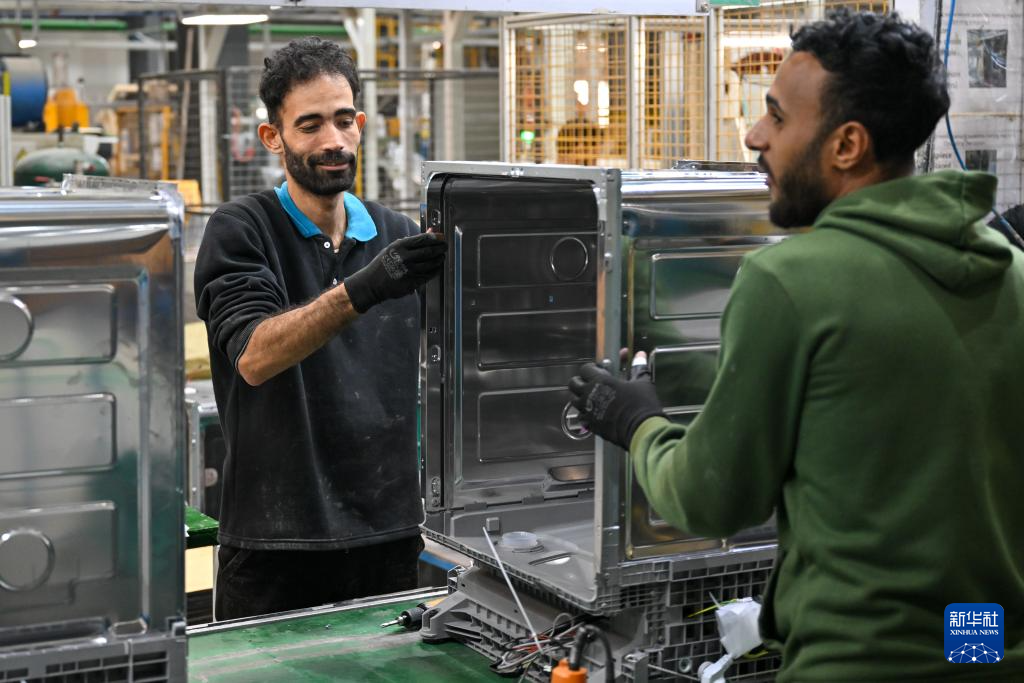 1月19日,在埃及蘇赫奈泉的中?!ぬ┻_蘇伊士經(jīng)貿合作區(qū),埃及員工在美的埃及廚房和熱水器有限公司洗碗機生產(chǎn)車間組裝洗碗機。新華社記者 辛夢晨 攝