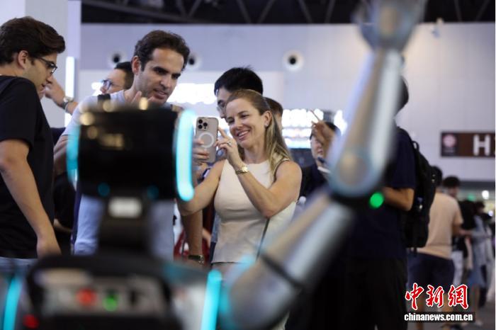2025年7月,在上海舉辦的2025世界人工智能大會上,一款中國制造的機(jī)器人吸引外國觀眾。 中新社記者 湯彥俊 攝