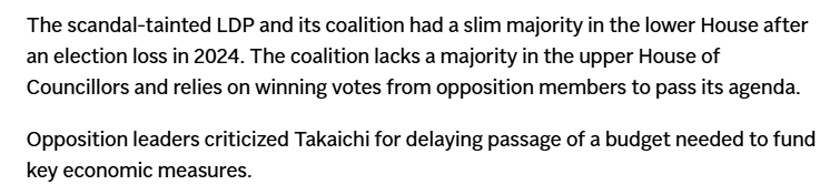 美聯(lián)社的報道認(rèn)為,高市提前解散眾議院并舉行大選的舉動是試圖利用其高支持率,幫近年來屢屢在大選中受挫的自民黨“收復(fù)失地”,而不顧此舉會導(dǎo)致眾議院推遲批準(zhǔn)一份旨在提振日本疲軟的經(jīng)濟(jì)、應(yīng)對物價飛漲的預(yù)算案。報道注意到,丑聞纏身的自民黨及其執(zhí)政聯(lián)盟在日本眾議院僅占微弱多數(shù),在參議院則不占多數(shù),要依靠贏得反對黨議員的選票來通過其議程;而反對黨領(lǐng)導(dǎo)人則批評高市早苗耽誤了為關(guān)鍵經(jīng)濟(jì)舉措提供資金的預(yù)算案的通過。