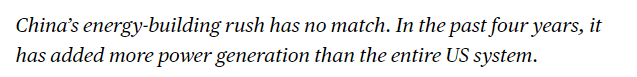文章說,中國(guó)的能源建設(shè)速度無與倫比。過去四年,中國(guó)新增的發(fā)電容量超過了整個(gè)美國(guó)電力系統(tǒng)的總和。這種大規(guī)模能源基礎(chǔ)設(shè)施投資幫助中國(guó)降低對(duì)化石燃料依賴,為人工智能數(shù)據(jù)中心等高耗能技術(shù)提供穩(wěn)定電力供應(yīng),從而在全球科技競(jìng)爭(zhēng)中獲得顯著優(yōu)勢(shì)。