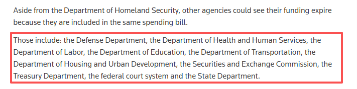 據(jù)路透社報道,美國國會每年需為438個聯(lián)邦機構(gòu)撥款,若未能履行該職責,相關(guān)機構(gòu)必須停止所有非必要工作。此次部分“停擺”涉及多個關(guān)鍵部門,包括美國衛(wèi)生與公眾服務(wù)部、交通部、證券交易委員會、財政部、聯(lián)邦法院系統(tǒng)等。