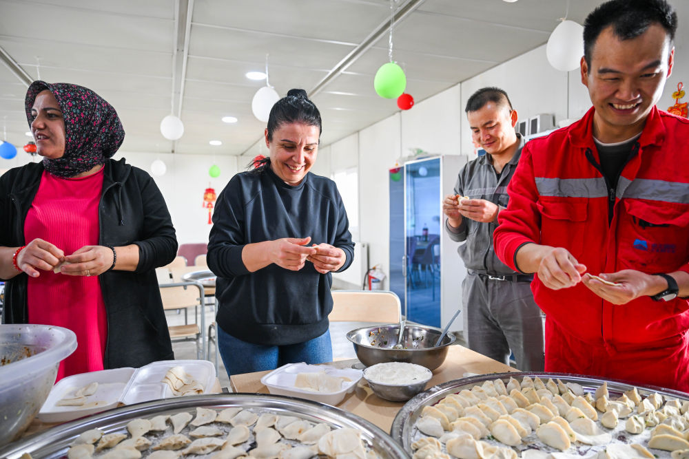 2月16日,在土耳其阿克薩拉伊省圖茲湖地下天然氣儲(chǔ)庫(kù)擴(kuò)建項(xiàng)目二期工程營(yíng)地,中土兩國(guó)職工在一起包餃子。新華社記者劉磊攝