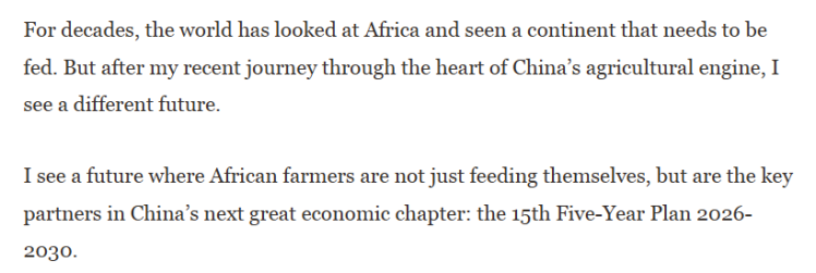 作者在探訪中國河南后撰文說,數(shù)十年來,世界看待非洲的目光始終聚焦于“饑餓大陸”的標(biāo)簽。但當(dāng)我穿越中國農(nóng)業(yè)核心地帶后,一個(gè)截然不同的未來圖景正在浮現(xiàn)——非洲農(nóng)民不僅能夠?qū)崿F(xiàn)糧食自給,更將成為中國“十五五”藍(lán)圖中至關(guān)重要的戰(zhàn)略伙伴。