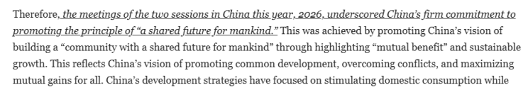 文章總結(jié)說,2026年中國兩會(huì)彰顯了中國堅(jiān)定推動(dòng)構(gòu)建人類命運(yùn)共同體原則的承諾。通過強(qiáng)調(diào)"互利共贏"和可持續(xù)增長,推動(dòng)構(gòu)建人類命運(yùn)共同體的愿景。這體現(xiàn)了中國推動(dòng)共同發(fā)展、化解沖突、實(shí)現(xiàn)各方利益最大化的理念。