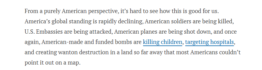 文章作者稱,(美國)這場“無緣無故且非法的軍事行為”已將地區(qū)拖入暴力升級的漩渦,導(dǎo)致數(shù)百名無辜平民喪生。即便從美國自身利益視角看,此舉亦難言獲益——美國全球地位正迅速下降,美軍士兵不斷傷亡,使館與飛機(jī)遭襲,而美國制造或資助的炸彈仍在遙遠(yuǎn)土地上造成平民死傷與基礎(chǔ)設(shè)施破壞。