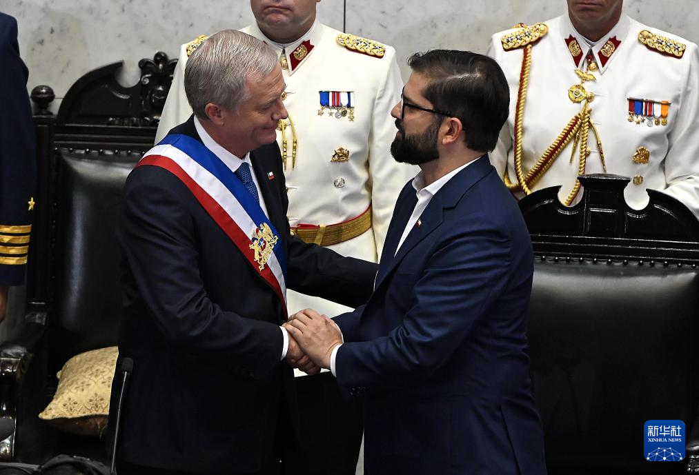 3月11日,在設(shè)于智利第二大城市瓦爾帕萊索的國民議會,智利總統(tǒng)何塞·安東尼奧·卡斯特(左)在總統(tǒng)權(quán)力交接儀式上與卸任總統(tǒng)博里奇握手。新華社/智利一號通訊社