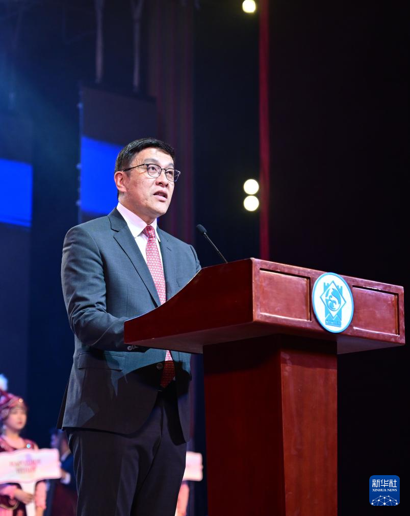 3月24日,在吉爾吉斯斯坦首都比什凱克,吉爾吉斯斯坦副總理拜薩洛夫在開幕式上宣讀總統(tǒng)扎帕羅夫的賀信。新華社記者 李任滋 攝