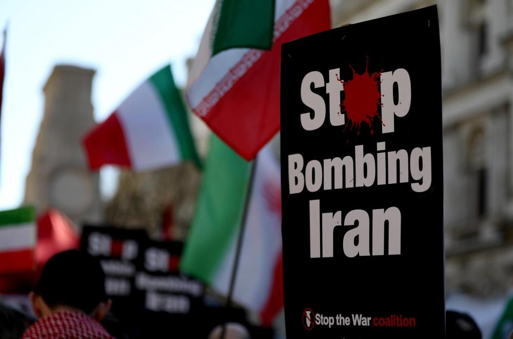 3月21日,人們在英國倫敦參加集會,抗議美國和以色列對伊朗發(fā)動軍事打擊。新華社記者李穎攝