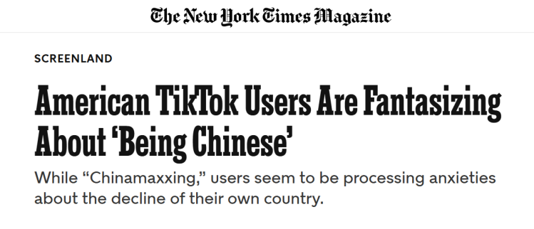 美國《紐約時(shí)報(bào)》日前刊文稱,“Becoming Chinese”(“成為中國人”)“Chinamaxxing”(“極致中國化”)等話題在海外社交媒體上火爆異常,大量網(wǎng)友模仿并表示自己愛上了中國人的生活方式。文章認(rèn)為,電動(dòng)汽車、醫(yī)療保障、高速鐵路,這些先進(jìn)事物逐漸揭開了中國生活的神秘面紗,也讓中國成為新一代旅游勝地——一個(gè)兼具超凡脫俗的自然風(fēng)光與現(xiàn)代科技的神奇的地方。在“極致中國化”體驗(yàn)過程中,西方網(wǎng)友們似乎在消化對(duì)本國衰落的焦慮情緒,美國民眾們仿佛能從這些視頻片段中看到一種尚未在本土實(shí)現(xiàn)的未來圖景,在他們看來,中國人高品質(zhì)、低成本的生活,穿著拖鞋、滋養(yǎng)脾胃的日常,應(yīng)是人人都能享有的生活常態(tài)。