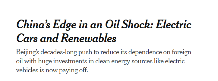 面對中東戰(zhàn)事外溢沖擊全球能源市場這一議題,《紐約時(shí)報(bào)》近日報(bào)道指出,在全球主要工業(yè)國紛紛陷入能源焦慮之際,中國通過數(shù)十年來大力投資電動(dòng)汽車和可再生能源,構(gòu)建起真正意義上的能源抗壓屏障。