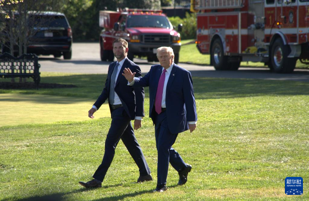 4月10日,美國總統(tǒng)特朗普(右)準(zhǔn)備乘直升機(jī)離開華盛頓白宮。新華社發(fā)(李源清攝)