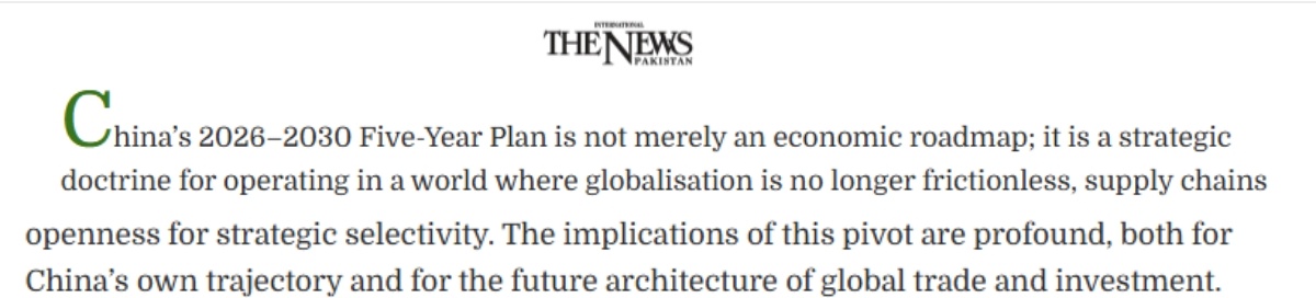 巴基斯坦《國(guó)際新聞報(bào)》近日刊文稱,“十五五”規(guī)劃綱要對(duì)中國(guó)而言不僅僅是一份經(jīng)濟(jì)路線圖,更是一項(xiàng)戰(zhàn)略方針。它不僅關(guān)乎中國(guó)自身的發(fā)展軌跡,也影響未來(lái)全球貿(mào)易和投資格局。